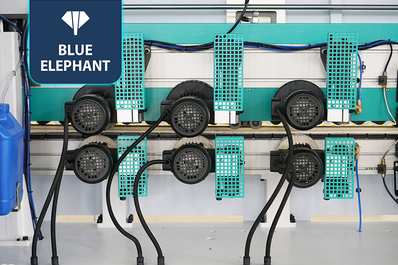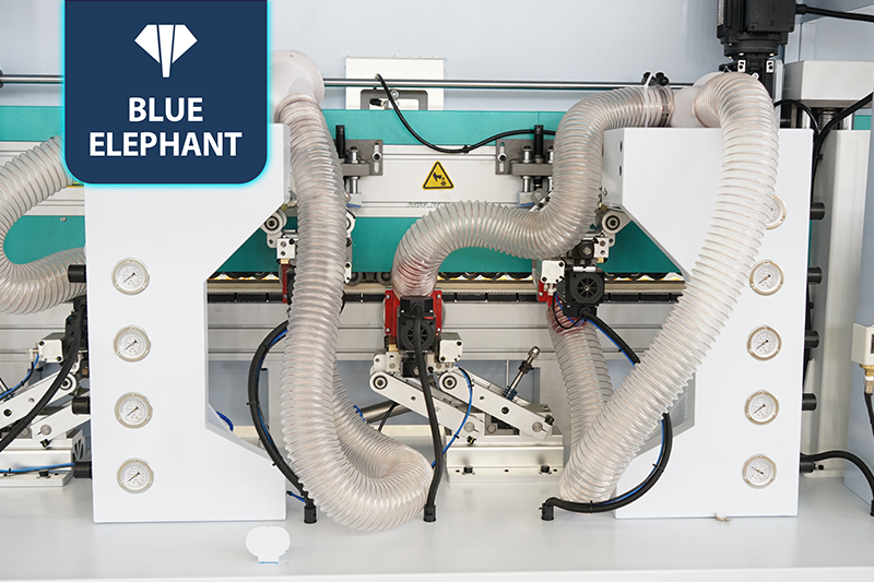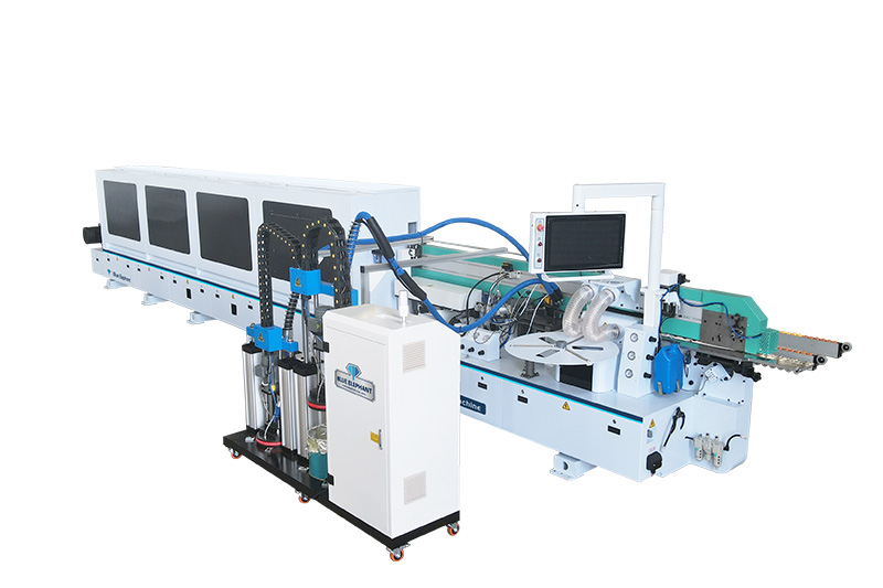 主要功能:分離→預(yù)銑→PUR膠鍋→皮帶壓輪→粗修→精修→刮邊1→刮邊2→齊頭→仿形跟蹤→平刮→清洗→拋光1→拋光2→拋光3。