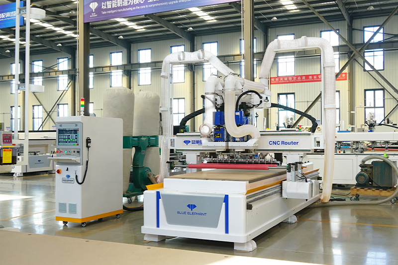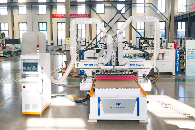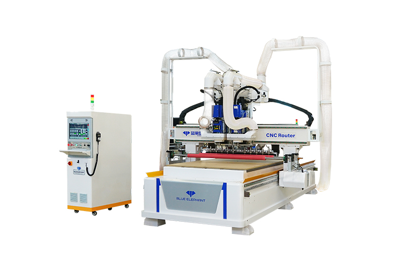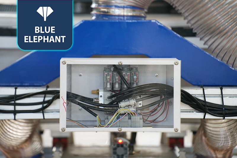 2.共兩套的9KW大功率主軸配備12位直排刀庫(kù)(每個(gè)主軸可配6把刀),高速開(kāi)料,刀庫(kù)合理分配,互不干擾;