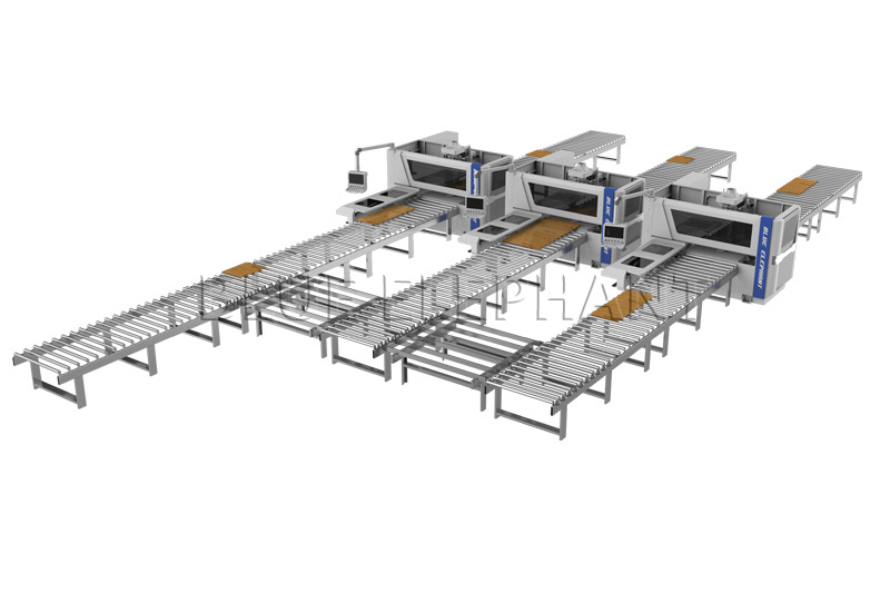 封邊完成的板材被送入至六面鉆---完成全部打孔后采用“前進前出”或“前進后出” 板料輸出方式---進入緩存?zhèn)},進行后續(xù)分揀打包