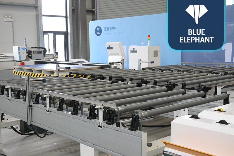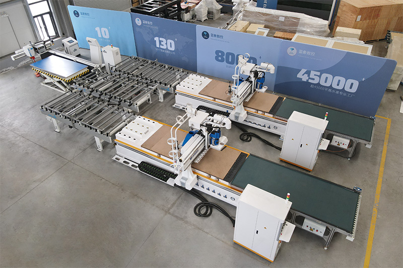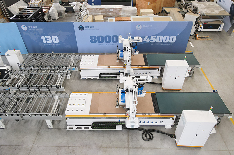 一拖二開料單元是一套自動化程度比較高的數(shù)控開料解決方案。開料單元由一臺高速自動貼標機、兩臺全自動數(shù)控開料中心以及動力滾筒線、中控系統(tǒng)組成。人工只需將板材放置在升降機上,由貼標機自動貼標,再由中控系統(tǒng)自動分配至開料中心,完成板材切割工作。如選配機器人系統(tǒng),可由機器人完成碼垛,余料利用及廢料輸出等工作。